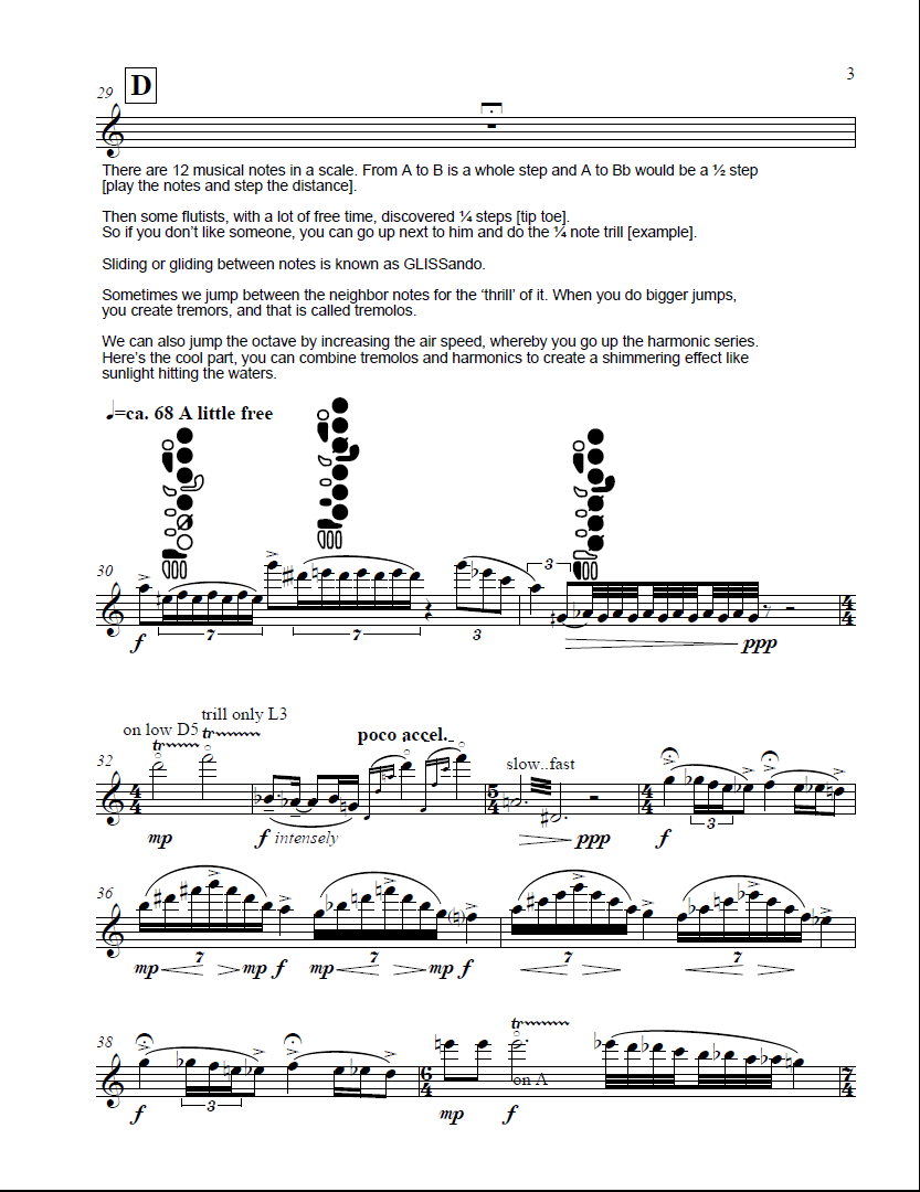 Section D talks about quarter tones, trills and tremolos, lip and finger glissando.