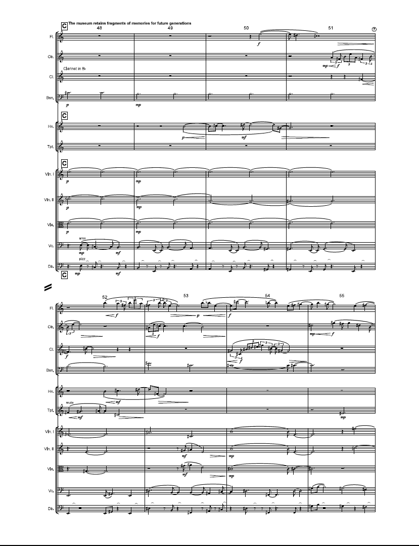 This movement is in 3 sections. ‘The survivors overcome grief and loss’ - The first three notes G-D#-C represent Unit 731. Other units which are represented are: 8604 (Guangzhou), 1855 (Beijing), 9420 (Singapore) and 1644 (Nanjing). ‘The survivors congregate for hope and peace’ - Disparate melodic lines eventually come together with more instruments playing in unison. Here, I see the survivors gathering to spread an important unified message to the world. ‘The museum retains fragments of memories for future generations’ - Previous materials return and generate a feeling of everlasting impact.