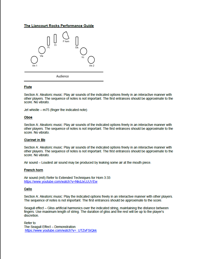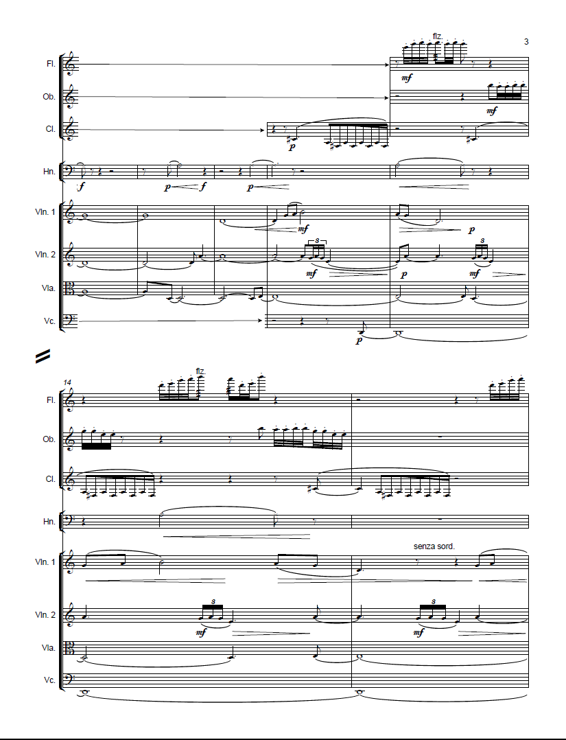 While writing this piece, I was conscious of the seating arrangements of the players and hence the positions of sound production. The constantly changing interaction of the players is the focus of the piece. The french horn has a very special role as an observer and peacekeeper. Musicians 'compete' for dominance in front of the french horn.