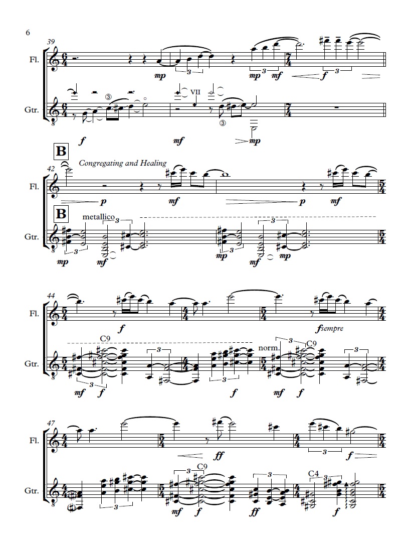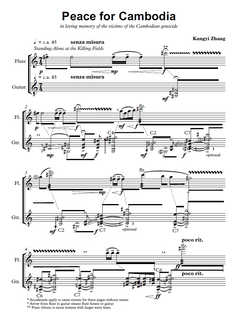 In the first section, a bird stands alone in the killing field. The inverted melody of the folk song "Sarika Keo Euy" is presented. This famous tune sings the praise of the sarika keo - a common starling bird. Guitar shock chords (formed from tritone and perfect 4th) gradually morph during healing. In "Awakening", the bird takes flight as depicted by the shimmering effect on the flute. Now, there is hope for peace. The timbre changes with the guitar harmonics and flute bisbigliando effects. In "Congregating and Healing", the survivors congregate and pray for peace. 45 years after the end of the genocide, Cambodians continue to heal and rebuild their nation.
